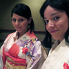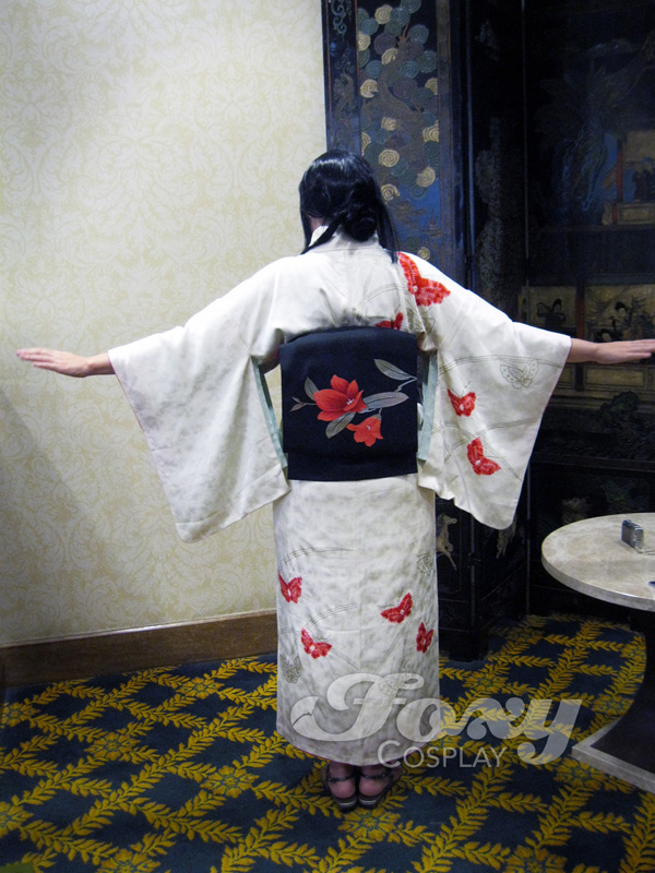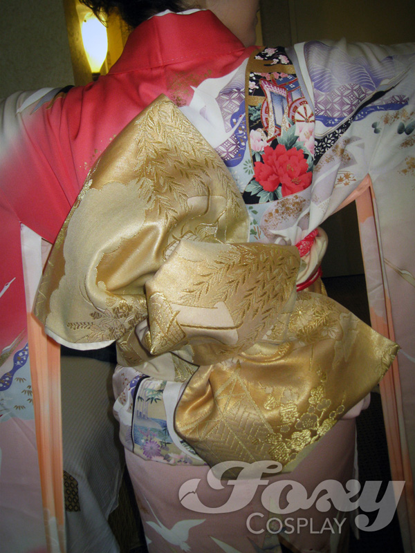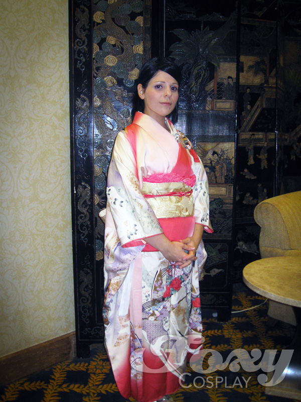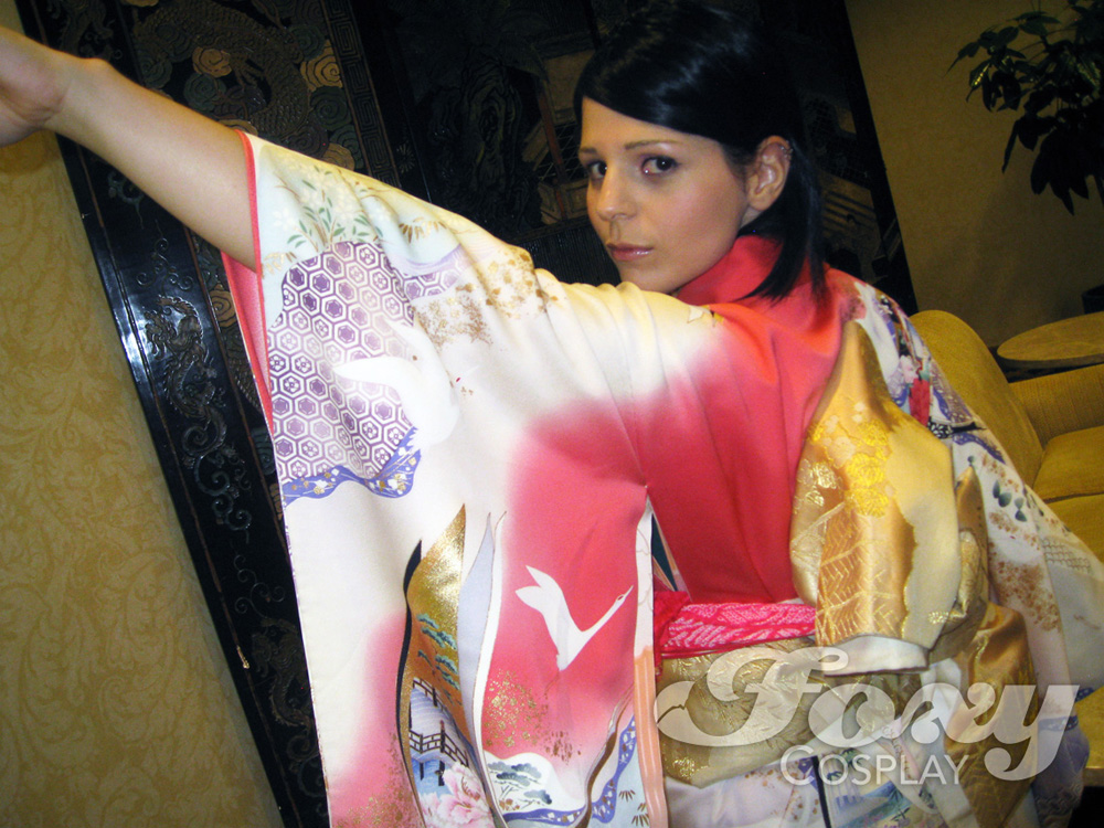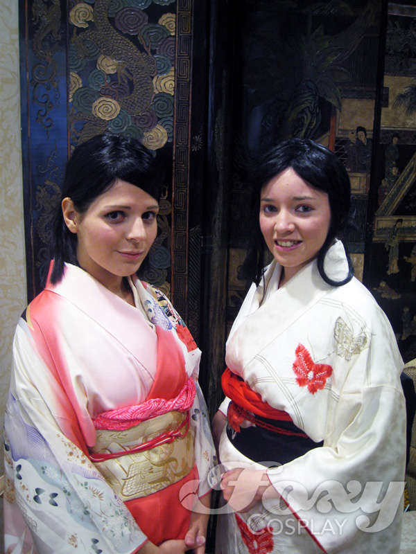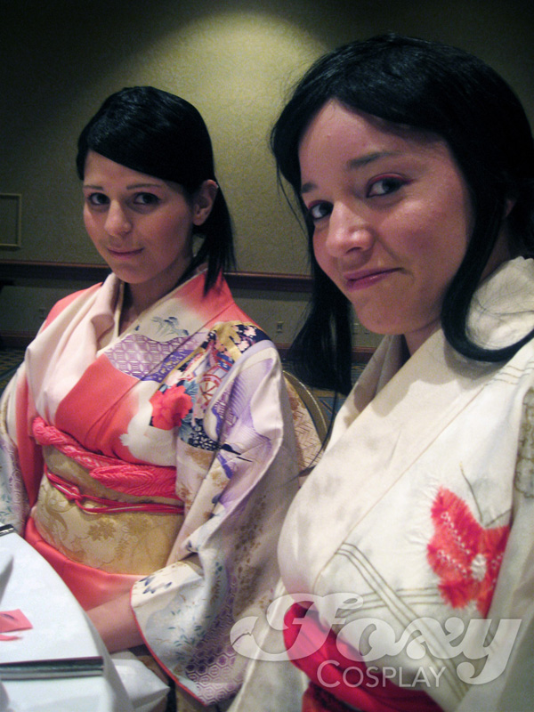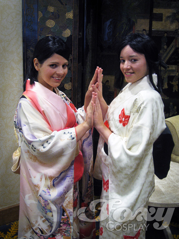 We attended the formal dinner at Mechacon VII and even though Asian attire was highly recommended we were the only ones in real formal kimono. As we were having dinner we realized our legs were completely exposed under the table so that gave us the idea to have a sexy shoot in the kimono afterwards. The pink one is a Furisode kimono worn by Maria and the other one is a HÅmongi kimono worn by Aimee.